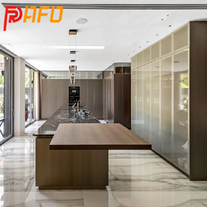 ตู้ครัวอัตโนมัติสีน้ำตาลสไตล์โมเดิร์นหรูหราเคาน์เตอร์หินแกรนิตที่กำหนดเองพร้อมเกาะรวมถึงอุปกรณ์บานพับก๊อกน้ำ