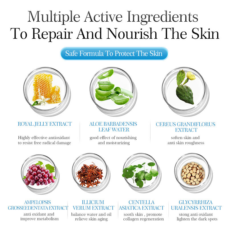ไข่มุก, คอลลาเจน, น้ำมันโจโจ้บา, ว่านหางจระเข้, ชาเขียว, วิตามินซี, กรดไฮยาลูโร, เชียบัตเตอร์, นำ้เชื่อมชนิดหนึ่งที่ใช้เป็นตัวละลาย, Sophora Flavescens, ข้าวกล้อง, AHA, ไนอาซินาไมด์, วิตามินอี, RETINOL, Purslaneส่วนผสมหลัก